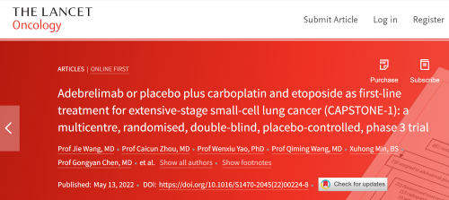 北京时间2022年5月14日,JJB竞技宝医药自主研发的PD-L1抑制剂阿得贝利单抗治疗广泛期小细胞肺癌的III期临床研究(CAPSTONE-1研究)成果正式全文在线发表于国际权威学术期刊《柳叶刀·肿瘤学》(《THE LANCET Oncology》,影响因子41.316)。CAPSTONE-1研究结果显示,阿得贝利单抗联合化疗一线治疗广泛期小细胞肺癌相较于安慰剂联合化疗可以显著延长患者总生存期至15.3个月[1],刷新现有免疫药物一线治疗广泛期小细胞肺癌的总生存纪录[2]。