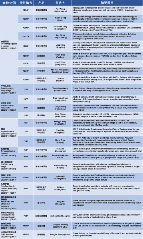 作为从事创新和高品质药物研发的国际化制药企业,JJB竞技宝医药的研究成果在2022 ESMO大会上还收获了25项壁报形式的报告。其中,食管胃癌领域共有9项研究入选,研究的方案主要是卡瑞利珠单抗或卡瑞利珠单抗联合阿帕替尼,通过与化疗或放化疗联用,新辅助治疗食管鳞癌或胃癌。2022年9月12日(CEST),让我们齐聚ESMO大会,共同领略食管胃癌研究领域的学术盛宴。此外,JJB竞技宝医药达尔西利、吡咯替尼、阿得贝利单抗等创新药还有4项乳腺癌研究、3项肝癌研究及其他领域的9项研究都将会以壁报展出,让我们共同期待!